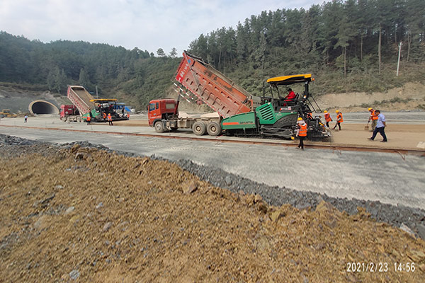 山推SRP09-C5 MA攤鋪機,雙機聯(lián)鋪助力貴州某高速道路建設(shè),施工路段約30公里,作業(yè)寬度為12m,作業(yè)厚度300mm,作業(yè)速度快,施工質(zhì)量高,獲得監(jiān)理的的一致好評。