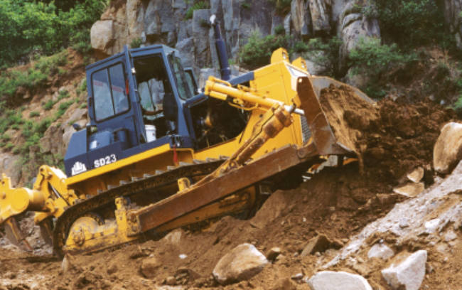 SD23推土機某山壩征戰(zhàn)作業(yè)。SD23推土機采用山推自制傳動系統(tǒng)和底盤系統(tǒng),配置重發(fā)/濰柴發(fā)動機,爬坡能力可達30°。由于超高的出勤率,超低的維護成本,贏得用戶充分認(rèn)可。