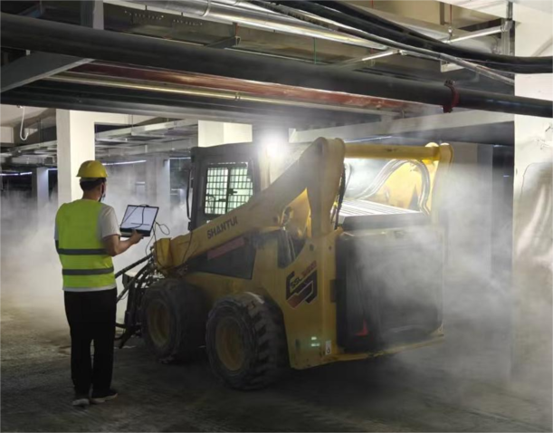 項(xiàng)目啟動(dòng)后,山推技術(shù)團(tuán)隊(duì)為客戶量身推薦了SSL75V-M滑移裝載機(jī),配置快換銑刨鼓及清掃器等屬具。面對地庫內(nèi)2.1米的高度限制,SSL75V-M整機(jī)高度僅2065mm,轉(zhuǎn)向靈活,在狹小空間內(nèi)表現(xiàn)出色;配套的大流量屬具液壓系統(tǒng),保障了銑刨鼓的動(dòng)力輸出,在硬質(zhì)水泥地面也能高效作業(yè),日均銑刨面積可達(dá)1000㎡,施工效率提升75%以上。